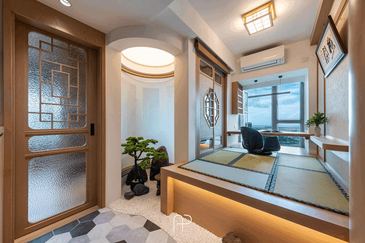 • 日式禪意元素: 空間融入榻榻米和地台設計,增添日式禪意,同時兼具收納功能。